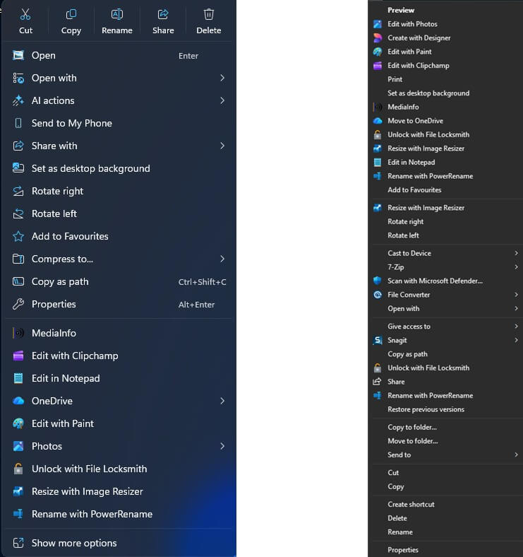 Up until the other day, I hadn’t noticed the menu key on my various keyboards, and it turns out that if you simply highlight an icon on your desktop with a left-click and then hit the menu key, the right-click dialogue appears. Or, in Windows 11, where that dialogue has been shrunk, hit Shift+Menu key and you get the full dialogue.
