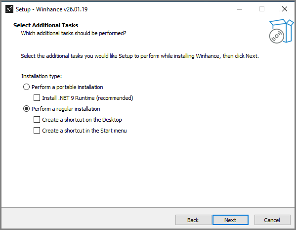 Winhance can either be fully installed or installed as a portable application: