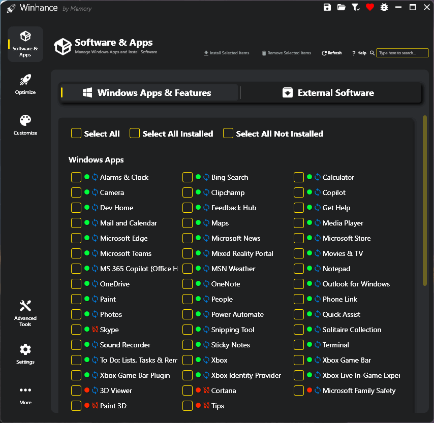 Down the lefthand side we have Software & Apps (the default view), Optimize, and Customize. Clicking Optimize and/or Customize brings up related Windows settings that you can adjust from within Winhance. Many of the optimization settings are already set to optimum within Winhance, with associated recommendations and tool tips.
