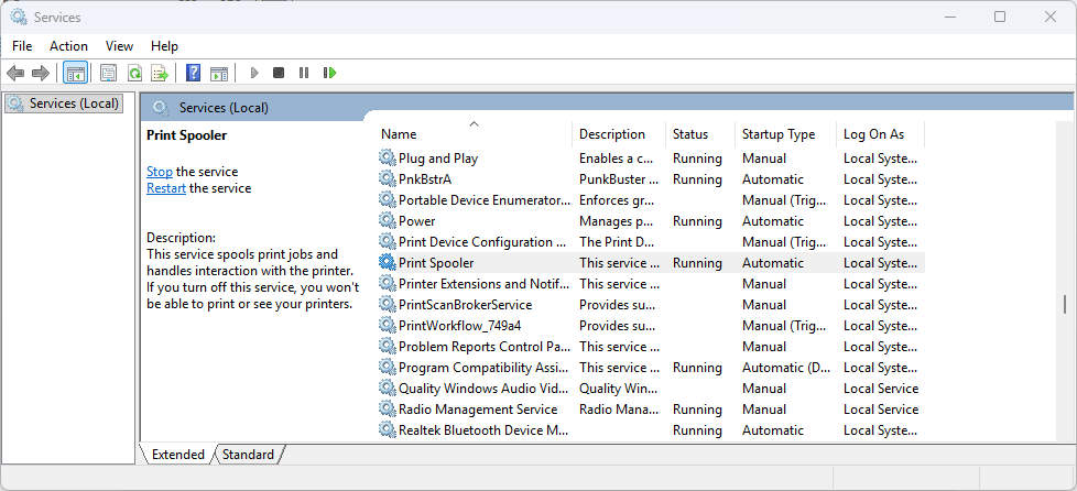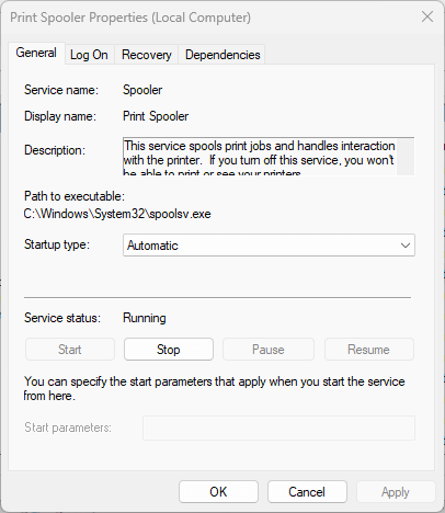To bring up services.msc, hit Win+r on your keyboard, type services.msc, locate Print Spooler (cola de impresión in Spanish) and check that it’s set to Automatic. Just in case, I stopped the service and then restarted it, but this didn’t fix the problem, even after a Windows restart.