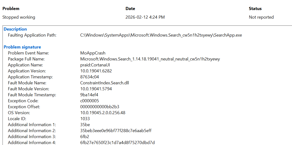 The mention of "Cortana" in the event error report is a tad concerning. Microsoft removed Cortana quite some time ago.