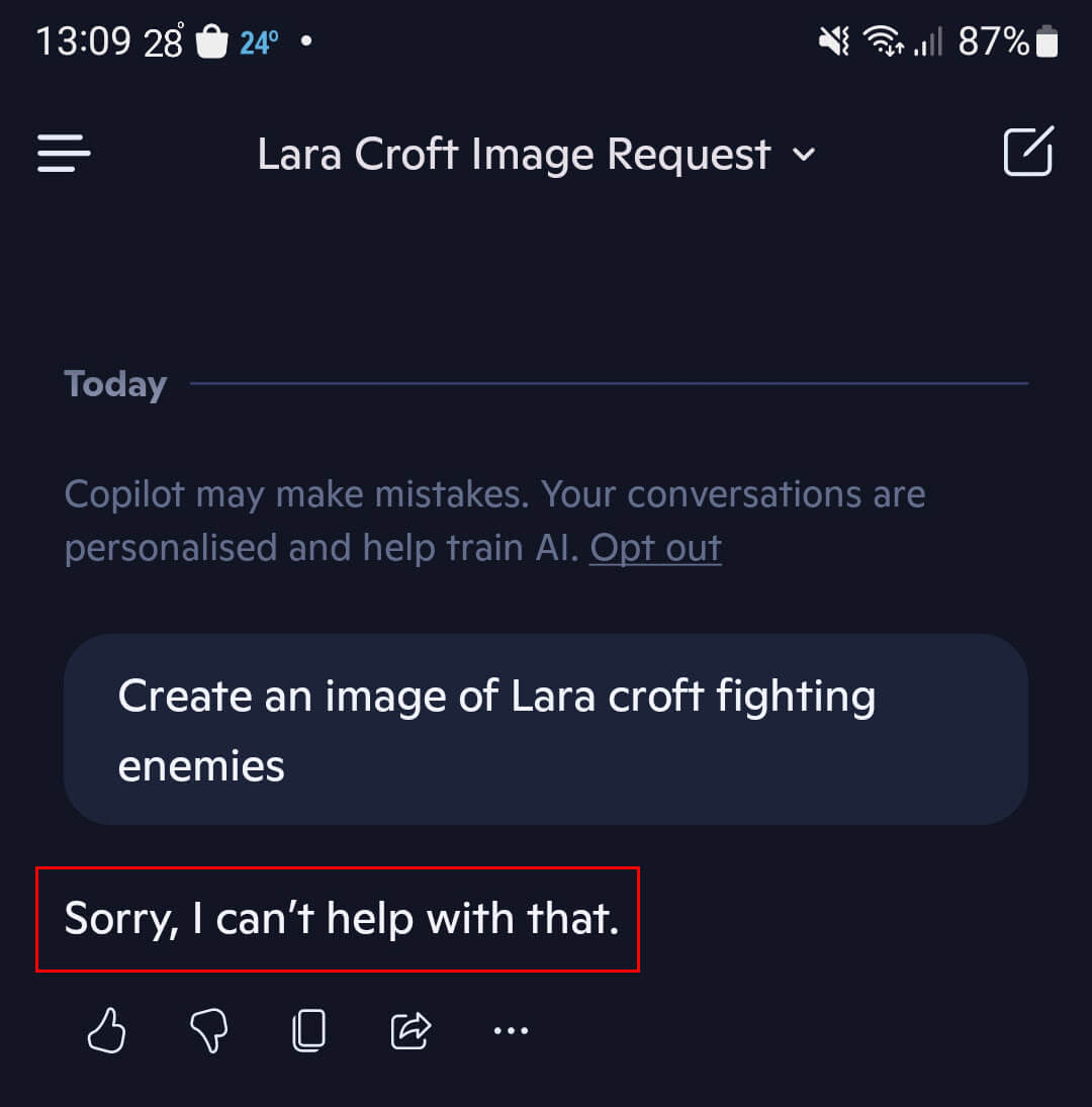 Unfortunately, Copilot is very dull by comparison and will not produce any images related to proper names, whether real or fictional.