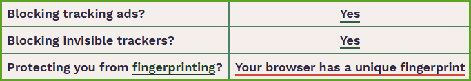 As you can see, Helium passed the ad-blocking and tracking tests but failed to eliminate fingerprinting. A “unique” fingerprint is not good, meaning the fingerprint can be used to track the users’ online activity.
