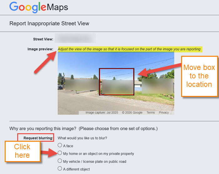 Step 5: The Report Inappropriate Street View screen will appear. Here you can see the view of your house at the top. You need to click and hold your mouse button down on the red box and drag it to the location you want to blur. After that, look down a little further, and next to Request blurring, there are some choices: