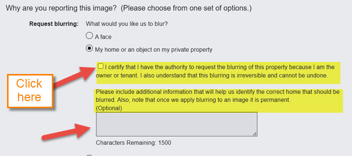 - I certify that I have the authority to request the blurring of this property because I am the owner or tenant. I also understand that this blurring is irreversible and cannot be undone