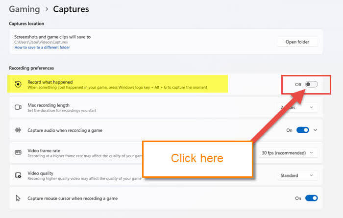 Step 4: The Gaming captures screen will appear. On this screen, look for the section Recording preferences. Under that, you will see many options that can be adjusted. The one we are looking for is this one: