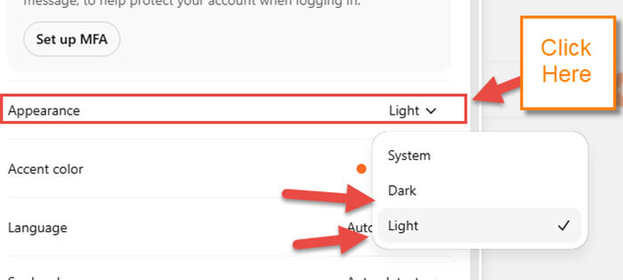 As with many online systems, you can change things from Light to Dark. With this one, it offers the same options. Click on the one you want. Now, let us move on down to the Accent color option.