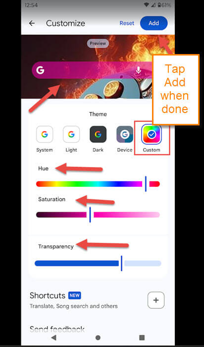 Step 7: Here are all the Shortcuts you can add to the Search Widget. You can only pick one, so choose wisely. After that, if you are happy with it, tap the Add button at the top right.