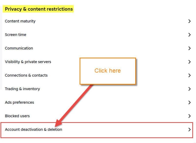 Step 4: On the Privacy & content restrictions screen, you will have a menu in the middle. Find the one called Account deactivation & deletion. Click it.