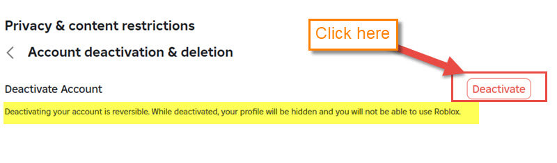 Deactivating your account is reversible. While deactivated, your profile will be hidden and you will not be able to use Roblox.