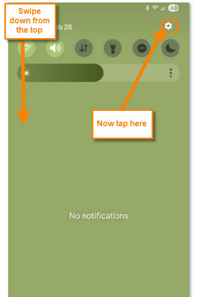 Step 1: Turn on your Samsung and swipe down from the top once. You should now see the Settings (gear icon) at the top right. Tap it.