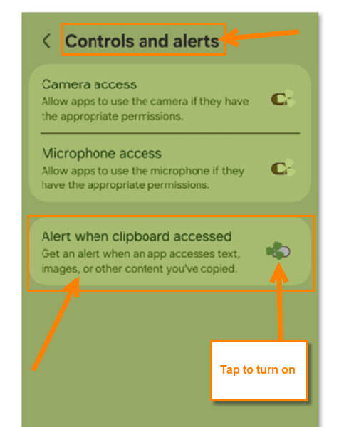 Step 4: Now that we are on the Controls and Alerts, we will be able to find the feature that will help protect your privacy. Look to the bottom option called Alert when clipboard accessed.