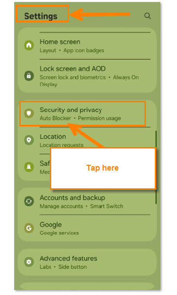 Step 2: Once on the Settings menu, find the Security and Privacy option. Tap it.