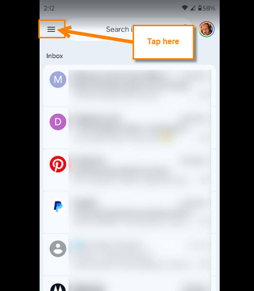 Step 2: Once on your Gmail app and under your account. Look to the top left for the menu lines. Tap it.
