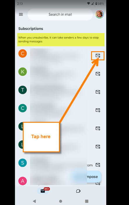 Step 4: You are now on the Subscriptions screen where all the email subscriptions attached to your Gmail are. Look to the right of the one you want to unsubscribe from. You will see an envelope icon. Tap it.