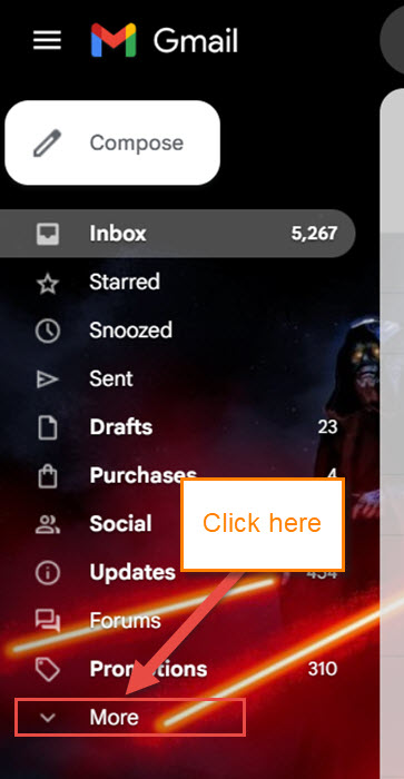 Step 2: Once on your Gmail account, look to the left menu. The option we are looking for is More at the bottom of that menu. Click it.