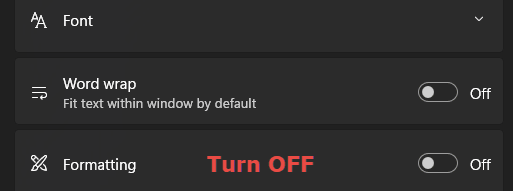 Many users view the lack of formatting as a huge plus, especially when using Notepad for chores such as stripping formatting from web text or compiling clean code. Toggling the formatting setting to OFF will eliminate the unwanted formatting.