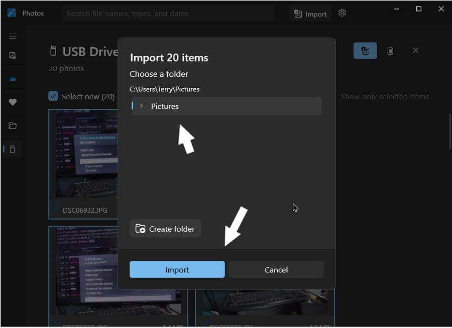 Now, click on “Import”. Wait a few minutes, depending on the number of photos you have. You should see a progress bar at the bottom. When finished, your pictures should be in the folder you selected.