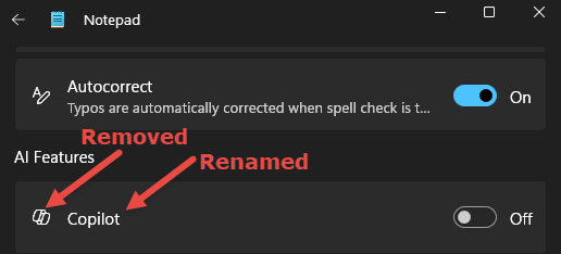 In Notepad’s case, the Copilot icon has been removed from the settings options, and that setting has been renamed from “Copilot” to “Writing tools”. However, the feature remains wholly Copilot-driven, so Copilot has not been removed at all, merely renamed.