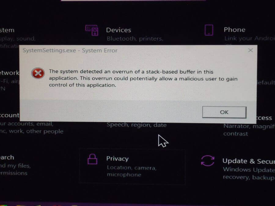 The system detected an overrun of a stack-based buffer in this application. This overrun could potentially allow a malicious user to gain control of this application.