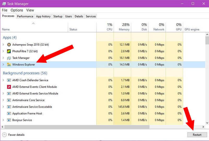 - I opened the Task Manager, clicked “Windows Explorer” in the task list, and then clicked “Restart” (in the lower-right corner).