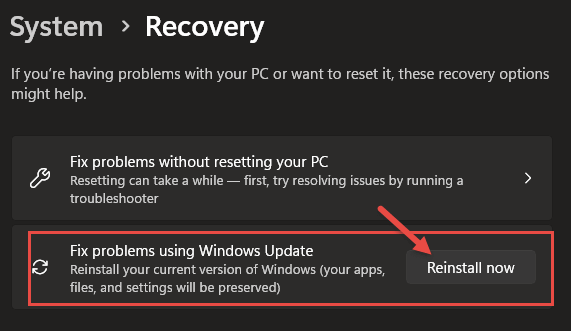 Nothing worked, so I ended up trying the Windows 11 in-place repair installation that’s available via Settings > System > Recovery > Fix problems using Windows Update > Reinstall now: